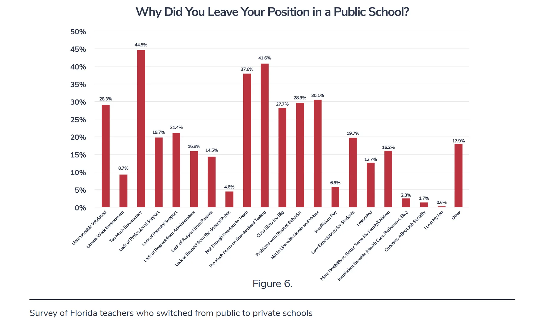 When respondents were asked why they left public schools, the most common responses were too much bureaucracy (44.6 percent), too much focus on standardized testing (41.6 percent) and not enough freedom to teach (37.6 percent). (Respondents could select more than one reason.) See Figure 6.