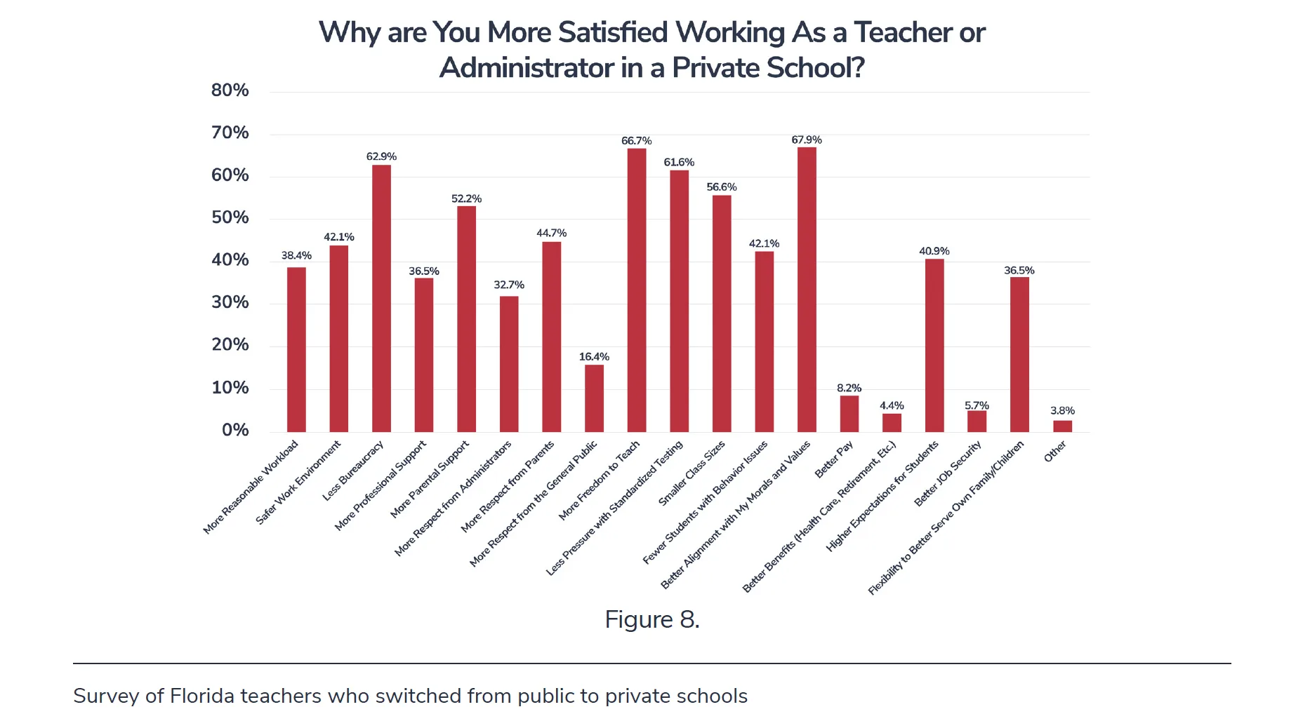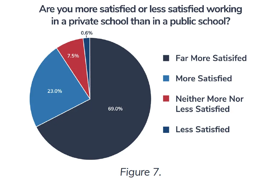 Among the top reasons for greater satisfaction: better alignment with morals and values (67.9 percent), more freedom to teach (66.7 percent), less bureaucracy (62.9 percent), and less pressure with standardized testing (61.6 percent). (Respondents could select multiple reasons.) Most were also more satisfied with smaller class sizes (56.6 percent) and greater parental support (52.2 percent). See Figure 8.