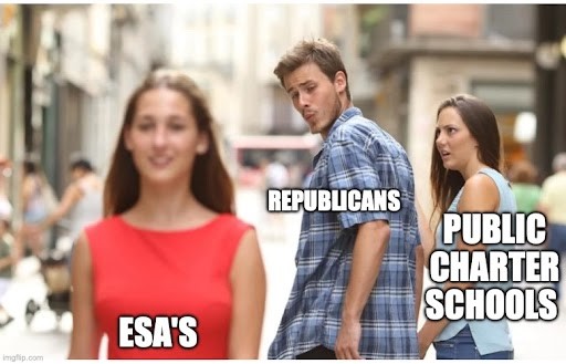 Recently Andy Rotherham tweeted and then wrote about the below image. Our own Travis Pillow then noted that both charter schools and ESAs were doing great in Florida at the same time. By the way, the character labeled “Republicans” could have just as easily been called “Families.”