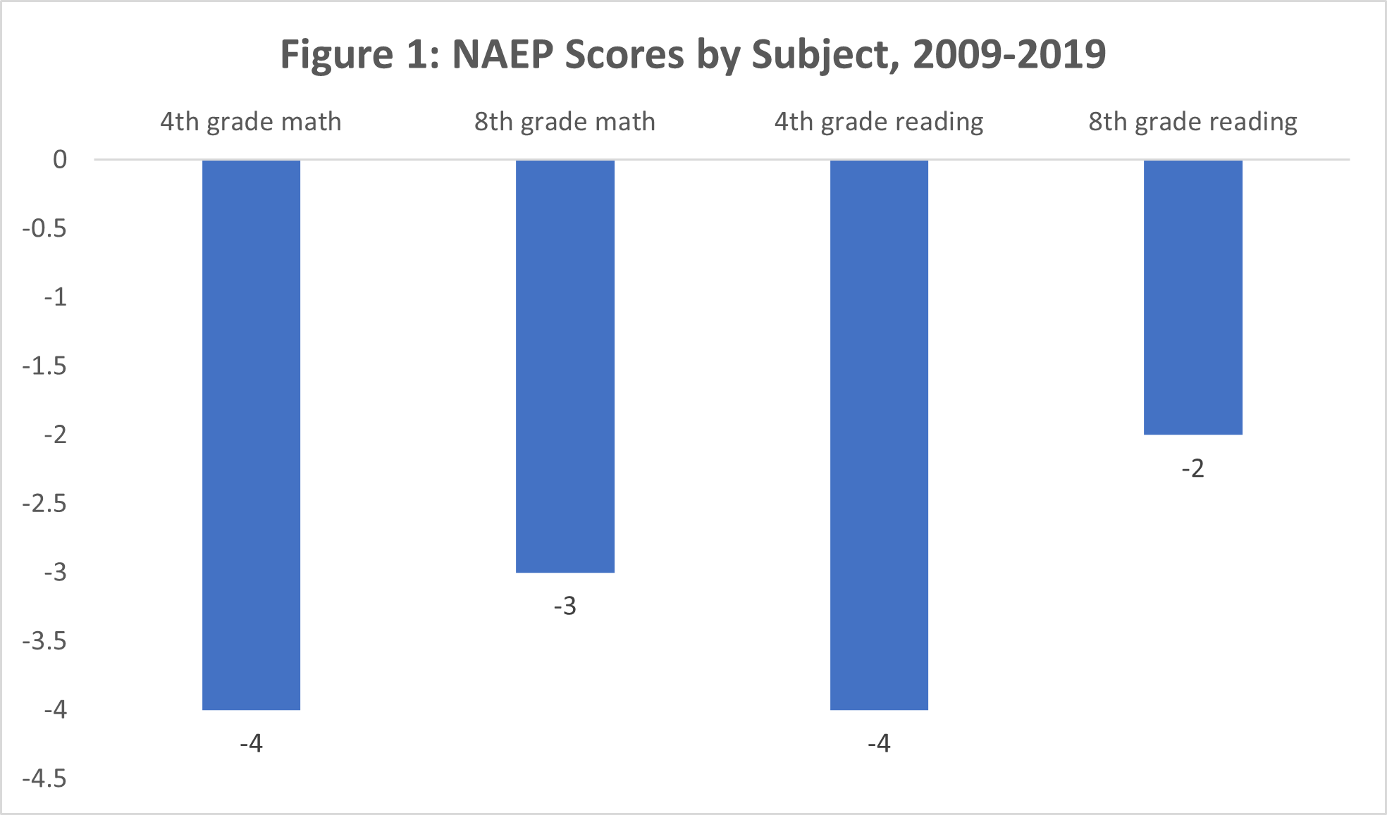 The upshot: Research shows that some teachers are catastrophically poor at getting students to learn (left side of the bell curve) while others are amazing (right side of the bell curve). Obviously what state lawmakers should do is to create a statewide evaluation system to remove the teachers on the left side, and average teacher quality will improve- in theory. As the Times Union article noted, New York had a policy to do just this in theory between 2010 and 2020. Let us then see what happened in New York NAEP scores in practice between 2009 (pre-policy) and 2019 (last NAEP under the policy and before COVID).