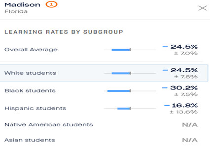 Below, for example, is a chart from the Stanford Educational Opportunity Project demonstrating the overall learning rates for Madison students in grades three through eight from 2008 through 2019, and by student racial/ethnic subgroup: