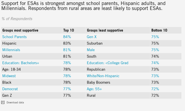 Polls, like the one above from Ed Choice, show that both Millennials and Gen Z show higher support for school choice than either Gen X or Baby Boomers. This is hardly surprising. There were only three channels on television (four if you count PBS) when Gen X was young, and we were thrilled when cable television came along and provided an additional 50 or so channels. Young people these days can stream anything, anytime, anywhere. Future generations will not even understand the phrase “cutting the cord” as they won’t have ever experienced a cord to begin with.