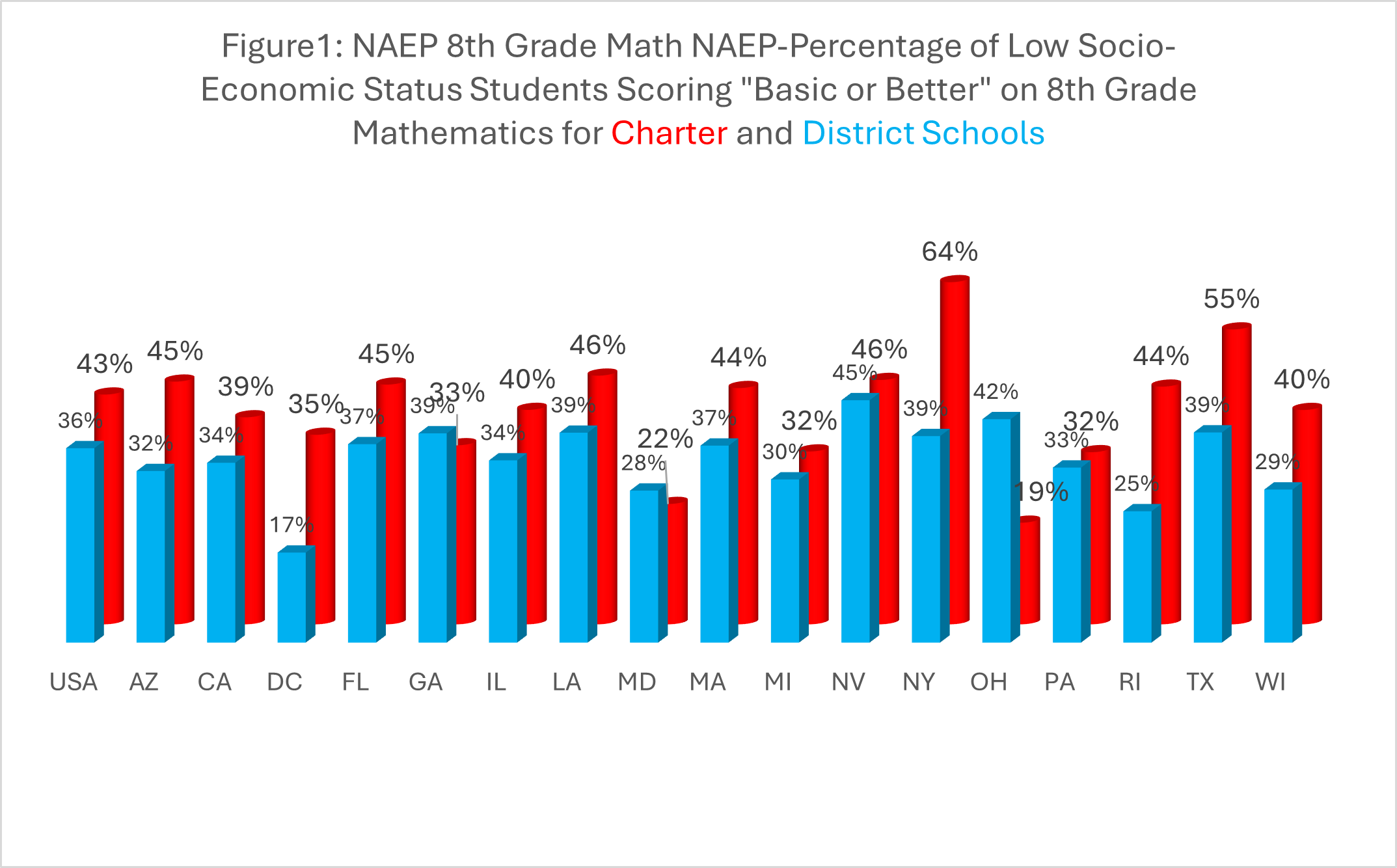 The National Assessment of Educational Progress (NAEP) created a new measure of socioeconomic status for the 2024 exams. This is a welcome addition, and a better measure of student economic status has proven revealing, specifically regarding charter school performance. Shifting eligibility criteria made the reliability of the old standby, free and reduced-price lunch, questionable over time. The new socioeconomic status variables incorporate surveyed measures of the number of books in the home and parental education into a new measure. Charter schools have succeeded in large part in their core goal of improving the academic achievement of disadvantaged students.
