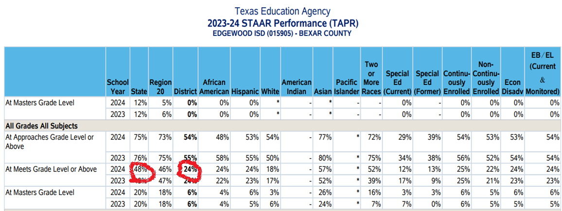Unfortunately, the Horizon program ended in 2007, and the recent academic results of the Edgewood ISD do not indicate that the incremental academic progress was sustained after the conclusion of the program. In 2023-24 Edgewood students had one half the rate of meeting or exceeding grade level compared to the statewide average. The cautionary tale from the Edgewood experience is what happens when students lack an exit option, not when they actually hold one.