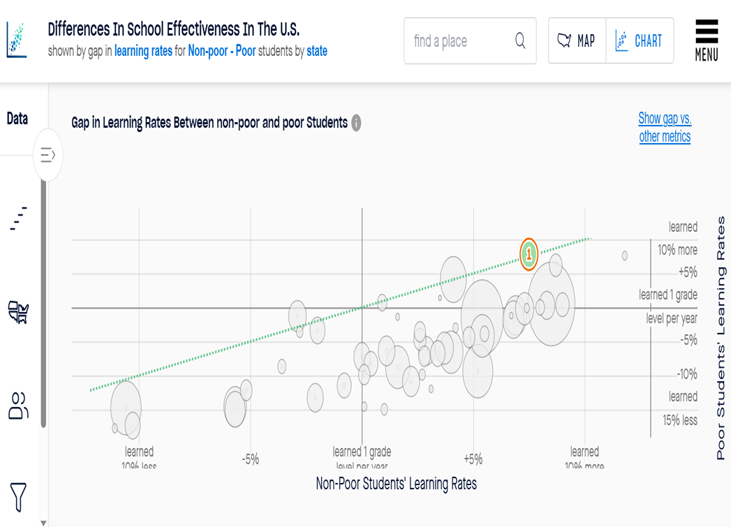 The Stanford Educational Opportunity Project also measures the gap in learning rates by subgroup, which is measured by subtracting the learning rate of poor students from that of non-poor students. The four jurisdictions lauded by Osborne ranked first, second, third, and fifth in comparison to Arizona counties in terms of the amount of learning rate inequality between poor and non-poor students. There was exactly one state that had a positive rate of academic growth for both poor and non-poor students and had a faster rate of academic growth for poor students. It is the state marked “1” and spoiler alert…it is Arizona, the host of multiple universal choice programs.