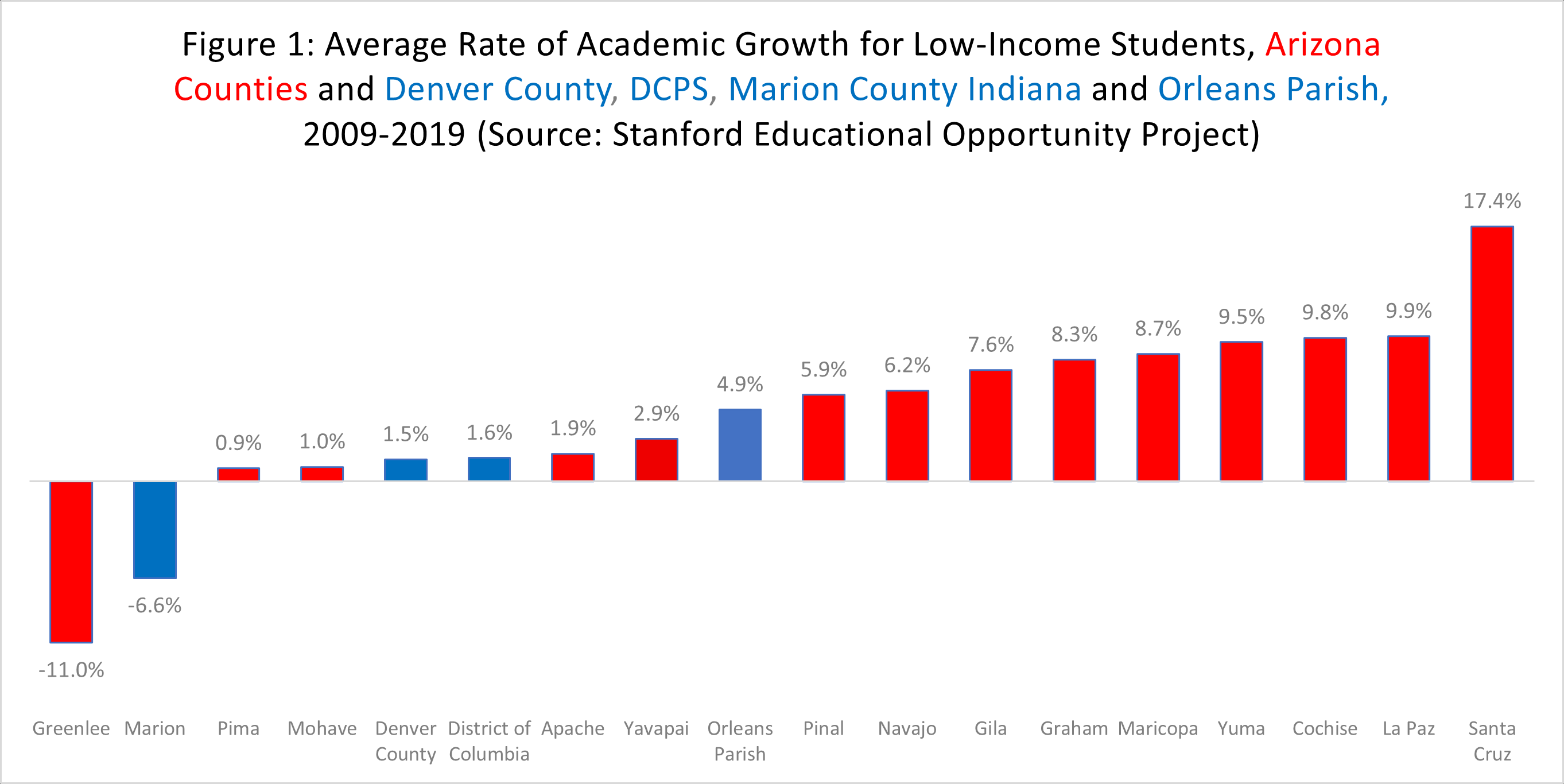 Given Osborne specifically cites four jurisdictions with the sort of choice programs of which he approves- Denver, Washington D.C., New Orleans, and Indianapolis, it seems in order. The Stanford Educational Opportunity Project provides academic growth data by jurisdiction (schools, counties, and states) and student subgroups for the 2009-2019 period. Comparing the rate of academic growth for low-income students in each of these four jurisdictions with those of Arizona counties in Figure 1: