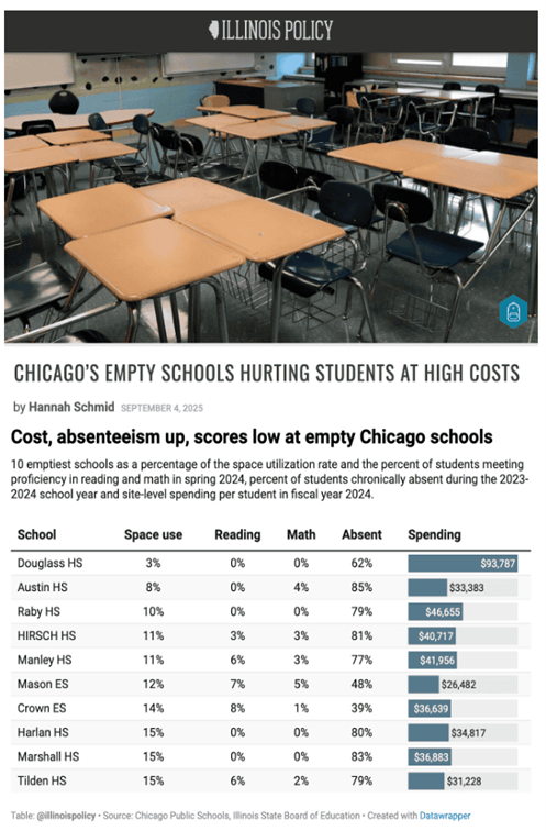 Federalism allows people of divergent views to effectuate different policy goals, a healthy design feature of the American Constitution. If your state uses their monopoly on force to require you to pay for the schools like those listed above, opting out sounds like a splendid idea. Finding yourself forced to pay for those schools is far more than anyone should tolerate. Finding oneself forced to pay for them and being required to send your children to them is far, far worse. Illinois policymakers would never inflict this on their own children but seem entirely content to do so on thousands of their fellow citizens.