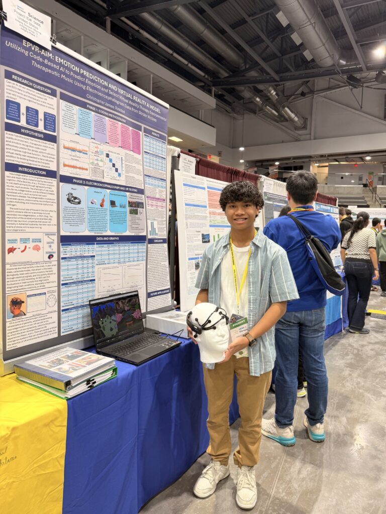 Using an electroencephalogram (EEG), which measures electrical activity in the brain, artificial intelligence, virtual reality, and violin music, Christopher was able to predict the moods and emotions of stroke victims who are unable to speak, thus creating a line of communication with doctors.