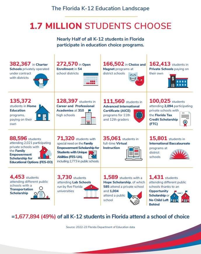A record-setting 1.7 million K-12 students in Florida attended a school of choice last year, an increase of more than 42,000 over the year prior. In all, 49% of Florida’s K-12 students attended an option other than their assigned neighborhood school in 2022-23. Private school, charter school and home education... READ MOREOptions on the rise: 1.7 million Florida students choose